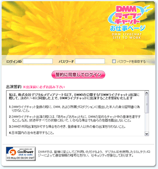 「チャットレディ登録の手順」で設定した「ID・パスワード」を入力します。 出演誓約をよくお読みになり同意したうえで「誓約に同意してログイン」をクリックします。